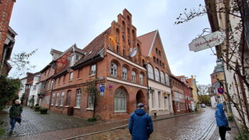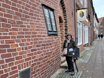 Um 11 Uhr begrüßte uns unsere quirlige Stadtführerin in der Hansestadt Lüneburg. Der Sage nach wurde das „goldene Salz“ von einem Jäger entdeckt, der eine weiße Wildsau beim Suhlen beobachtete. Das Salz machte die Stadt reich – heute wird nur noch das Kurzentrum von einem Pumpenhaus versorgt. Die Salzgewinnung wurde um 1980 eingestellt, und die natürlichen Ausspülungen der Salzsohle sind bis heute sichtbar: das „schwangere Haus“ und ganze Stadtviertel, deren Wohnzimmerfenster bis zur Türschwelle reichen, zeugen davon.